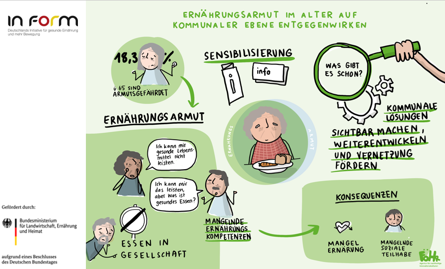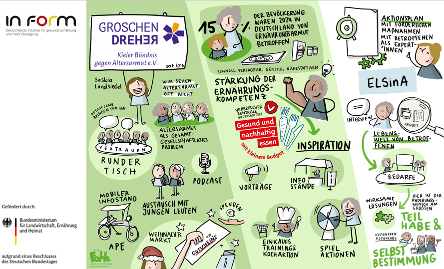 Als drittes Projekt wurde ELSinA (Ernährung- und Lebensbedingungen von Seniorinnen und Senioren in Armut) vom Max-Rubner-Institut in Karlsruhe von Tanja Kaufmann und Charlotte Beckh vorgestellt. Ein zentraler Aspekt dieses Projektes ist ebenfalls die Berücksichtigung der Perspektive von Betroffenen. Dazu wurden Menschen in Armut gesucht und zu ihren Ernährungs- und Lebensbedingungen befragt. Aus den Ergebnissen wurde ein Aktionsplan und verschiedene Zielsetzungen entwickelt. Hierzu wurden Vertreter*innen anderer Institutionen eingeladen, die in Innovationsteams Maßnahmen für diese Ziele zu erarbeiten. Die Vernetzungsstelle Seniorenernährung Niedersachsen ist mit dabei und entwickelt ein neues Konzept für Essen in Gemeinschaft, die im IN FORM-Projekt pilotiert werden soll.